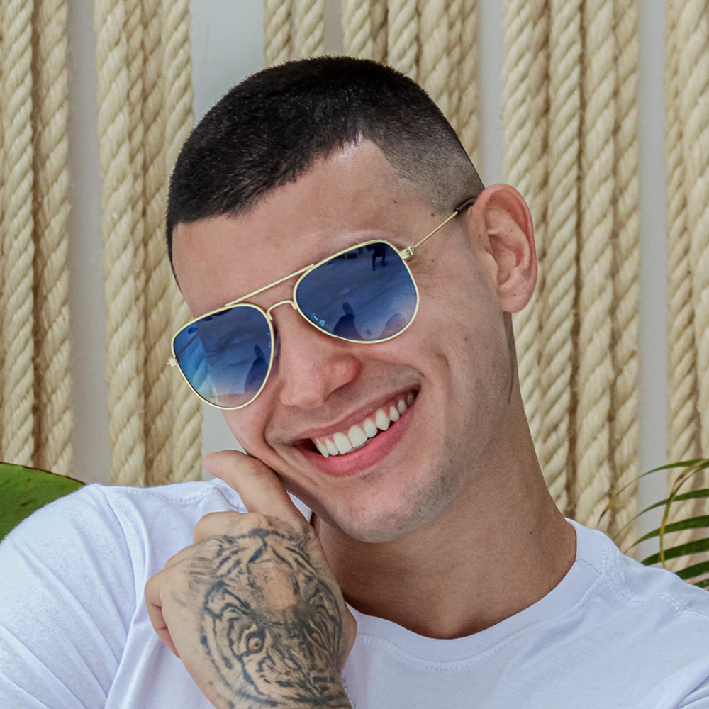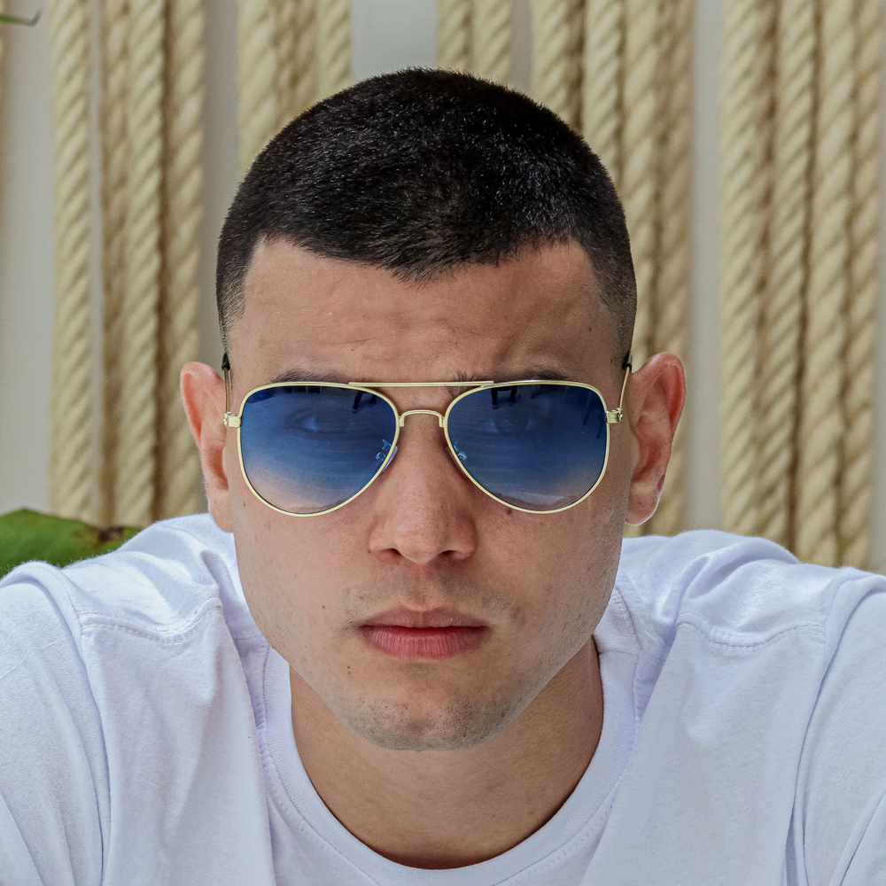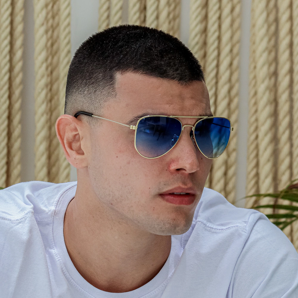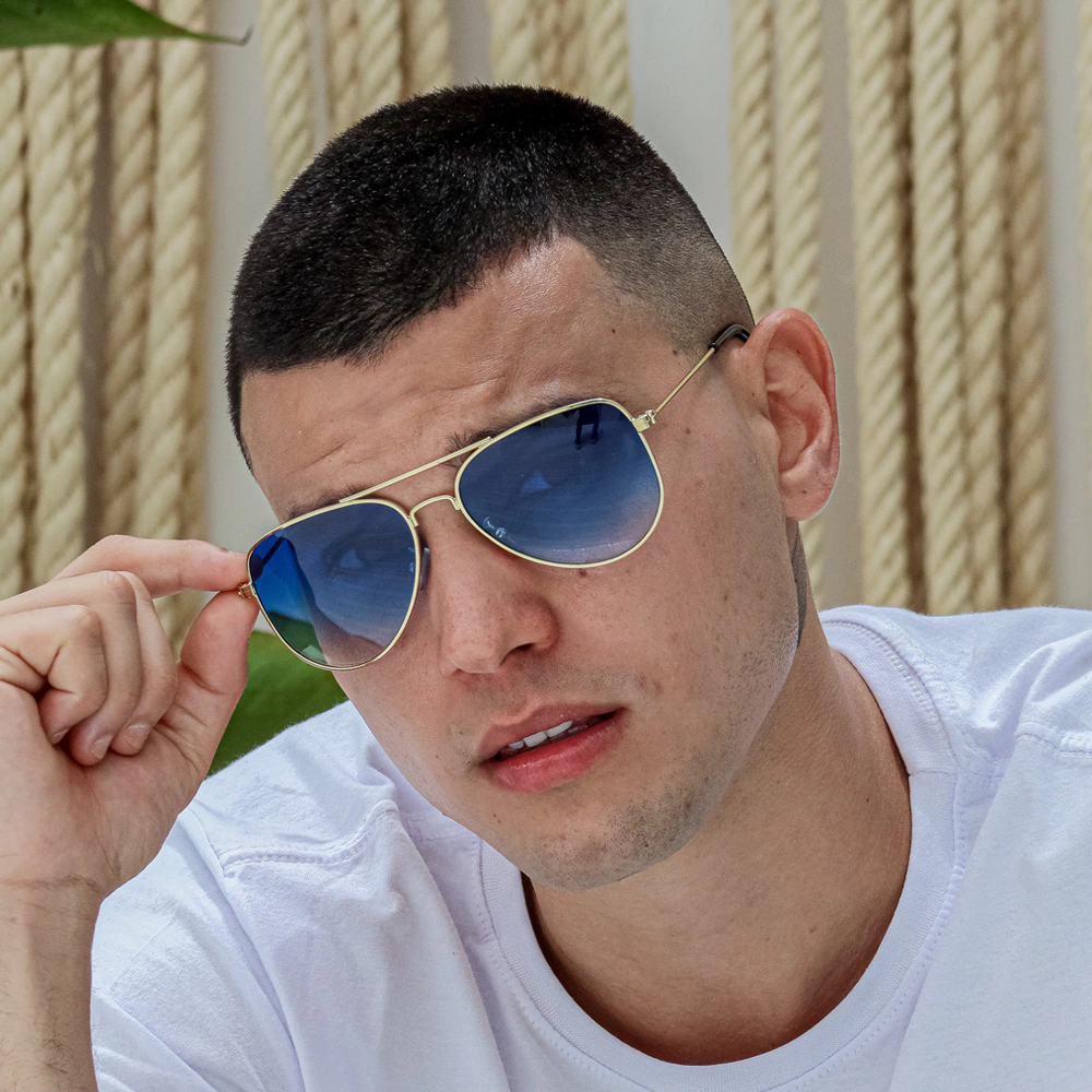 O Óculos de Sol Aviador Classic Azul Degradê combina tradição e atitude para homens que buscam um acessório sofisticado e imponente. Seu design aviador clássico é complementado por uma armação 100% em metal anticorrosivo dourado, garantindo resistência e durabilidade. As lentes degradê azul adicionam um toque moderno, proporcionando um visual marcante e proteção para os olhos.